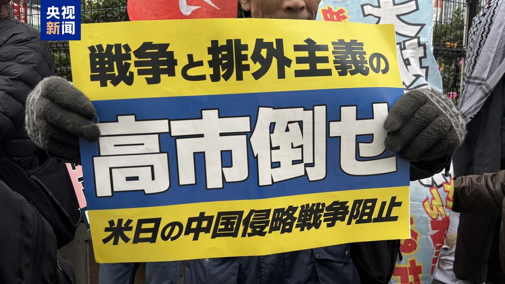 总台记者在现场看到,日本民众举着“打倒高市”“阻止美日对中国发动侵略战争”等标语,要求日本首相高市早苗撤回涉台错误言论。(总台记者 刘耀鸿)