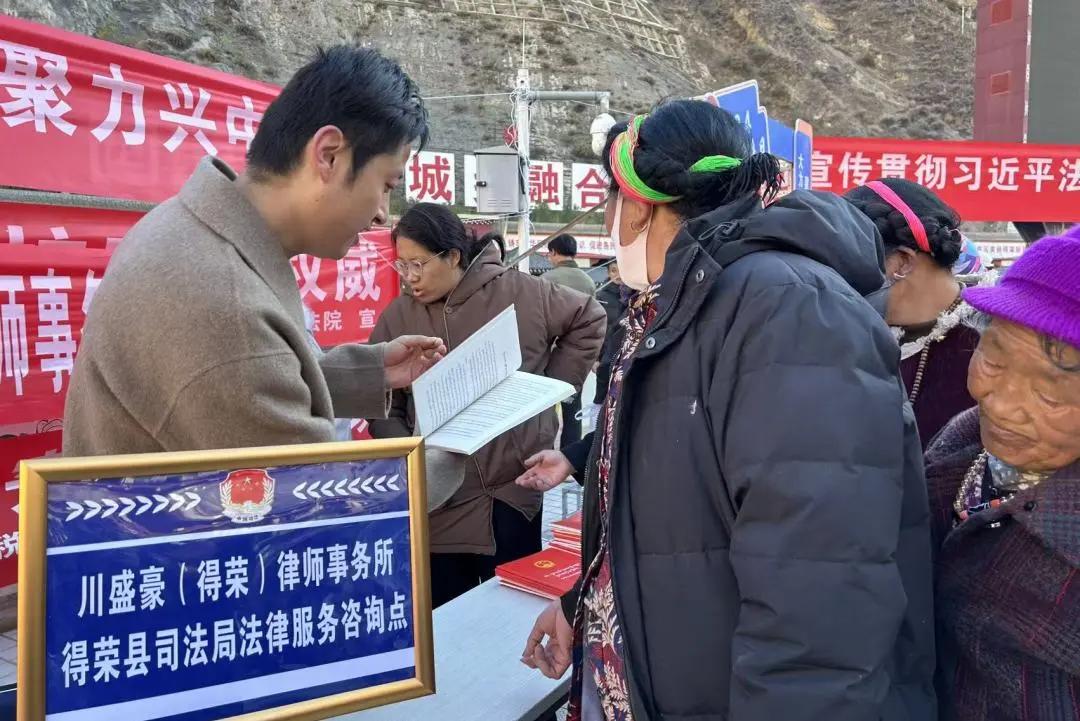 在甘孜州得荣县,盛豪得荣分所张志波、马蕊律师走进太阳谷广场,设立便民法律服务咨询点。活动现场,两位律师围绕宪法核心条款,向过往群众普及公民基本权利与义务等基础法律知识,耐心解答大家在婚姻家庭、邻里纠纷、权益维权等方面的疑问。