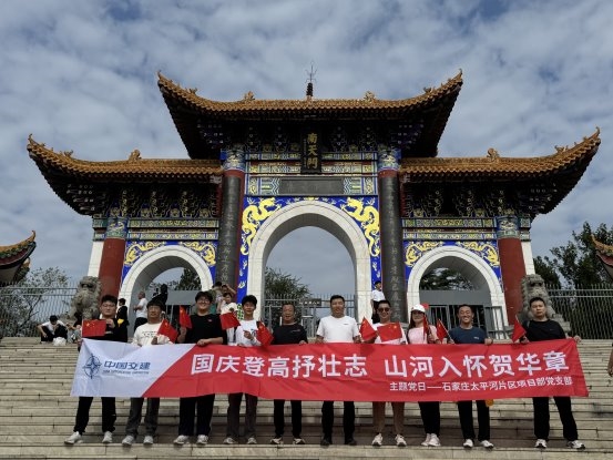 共工新闻社10月16日电(通讯员:庞娟娟)国庆、中秋双节同庆之际,为丰富职工文化生活,让大家在忙碌的工作之余放松身心、实现劳逸结合,家庄太平河片区项目部党支部组织党员及职工,奔赴石家庄抱犊寨风景区,以“国庆登高抒壮志 山河入怀贺华章”为主题开展特色党日活动。