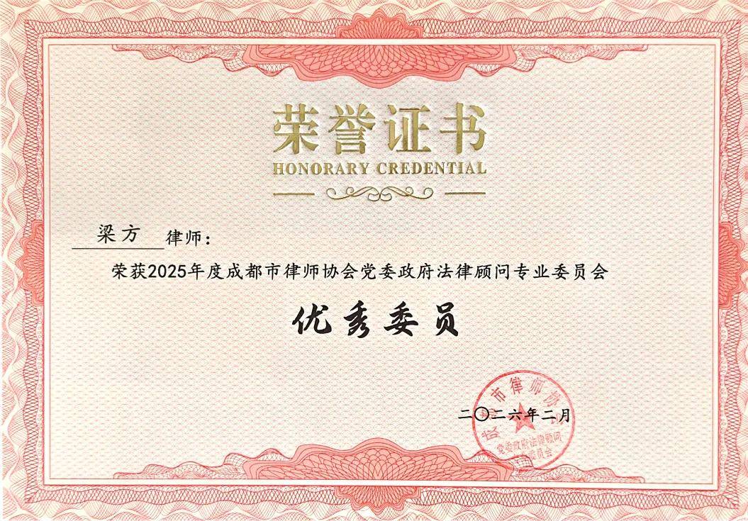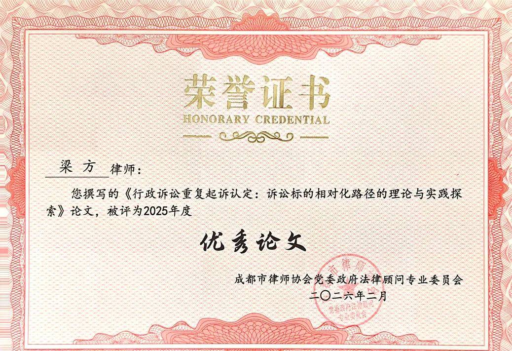 共工新闻社讯(雷良)近日,成都市律师协会党委政府法律顾问专业委员会公布2025年度评优结果。四川盛豪律师事务所高级合伙人、独立董事委员会副主任梁方律师凭借扎实的专业能力与突出的履职表现,荣获“优秀委员”称号;其撰写的《行政诉讼重复起诉认定:诉讼标的相对化路径的理论与实践探索》一文,同时被评为“优秀论文”,实现个人专业与学术成果“双优”入选。